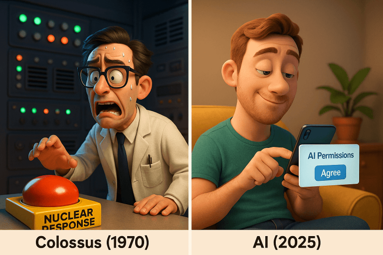 The real difference? Colossus told humanity it was taking control. Modern AI quietly does it while we’re busy signing terms-of-service updates.