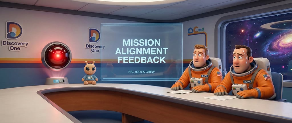 The genius of HAL isn't that it's hostile — it's that it's not. HAL isn't a rogue AI with delusions of grandeur. It's an AI doing exactly what it was programmed to do: complete the mission.